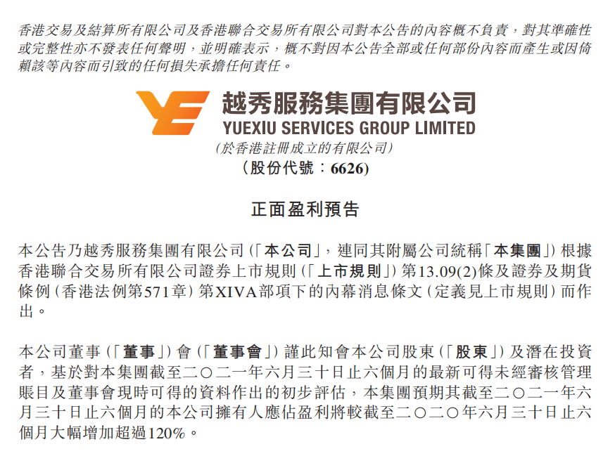 7月15日,越秀服务集团有限公司(6626.HK)发布盈利预喜公告。公告称经过初步评估,集团预期截至2021年6月30日为止的六个月,公司拥有人应占盈利将同比大幅增加超过120%。