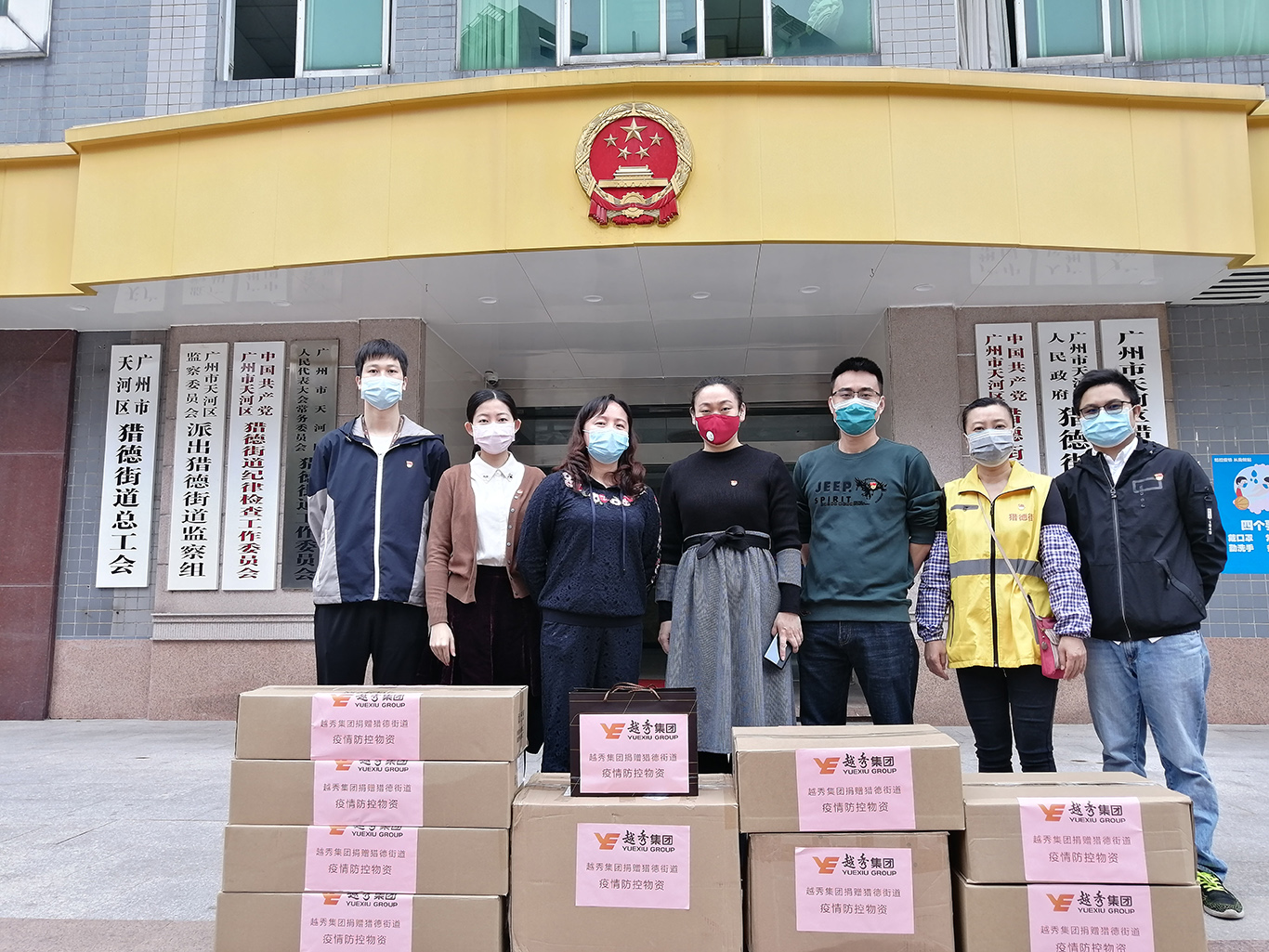 The Communist Party Committees of Guangzhou Government and Guangzhou State-owned Assets Supervision and Administration jointly carry out the "Five-One" Campaign to mobilize the communists working in the state-owned enterprise to support epidemic prevention and control among the communities in urban and rural area, as well as to support resumption of work and production of enterprises. Yuexiu Group, corresponding to such call, has donated a batch of epidemic prevention materials, including masks, the forehead temperature guns, hand sanitizers, alcohol, hygienic tissues etc to Liede Street in Tianhe District where it is located.
